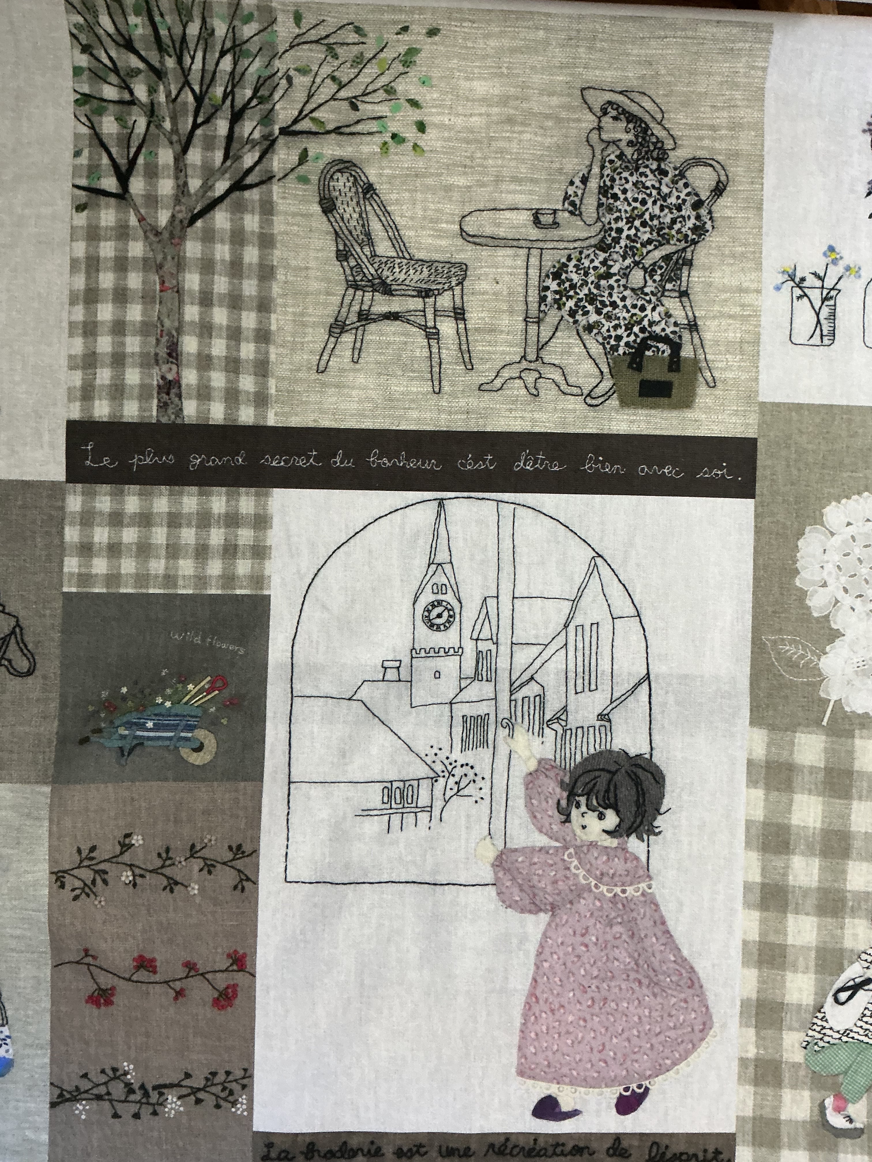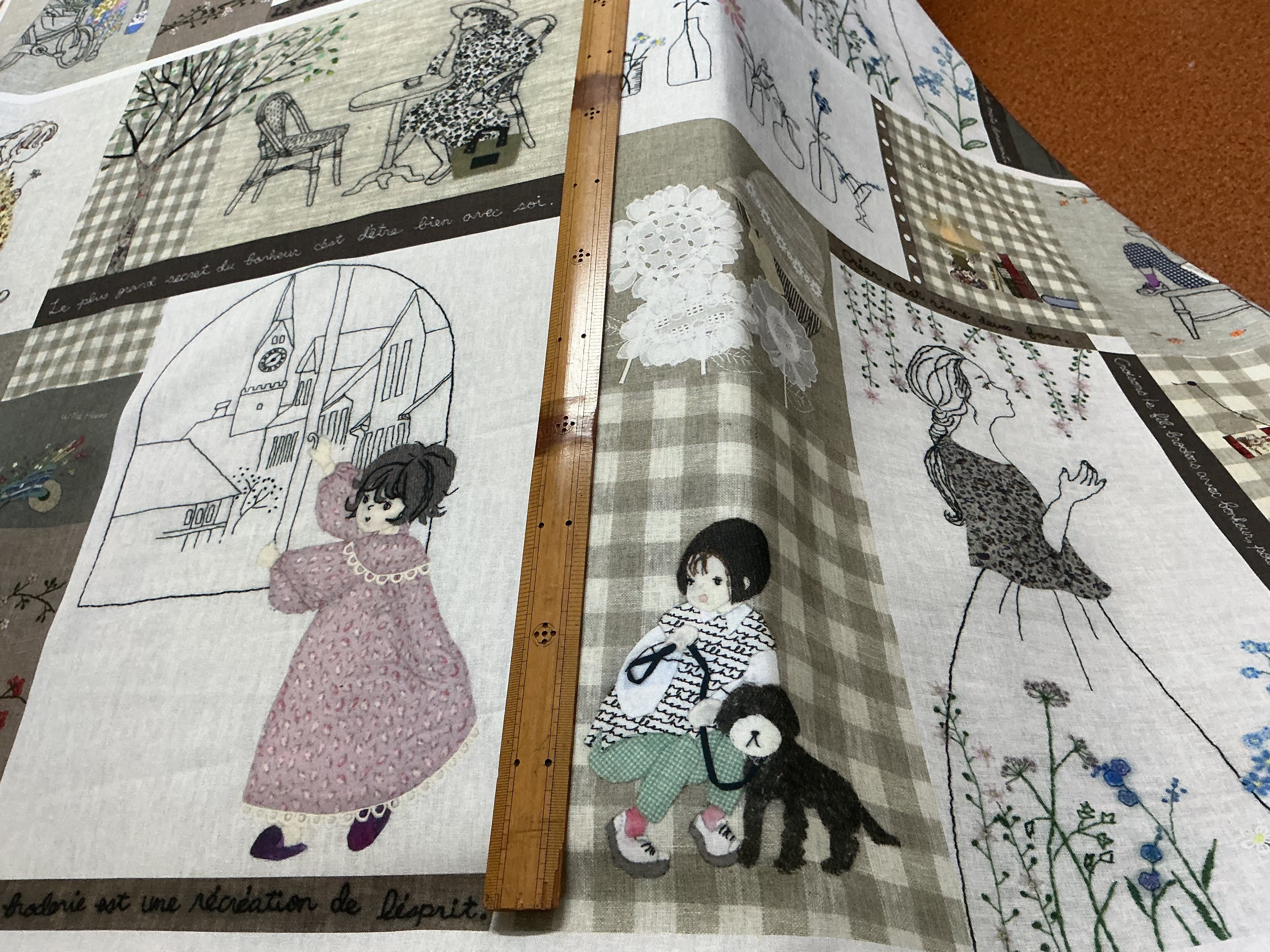 麻地にアップリケと刺繍で花と女の子のいろいろな 場面を表現したパネル柄を綿100%のコットン生地にプリントしました
